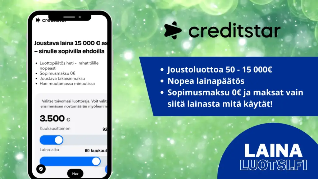 CreditStarin kautta voi hakea joustoluottoa, eli vakuudetonta lainaa alkaen 50 eurosta aina 15 000 euroon asti.