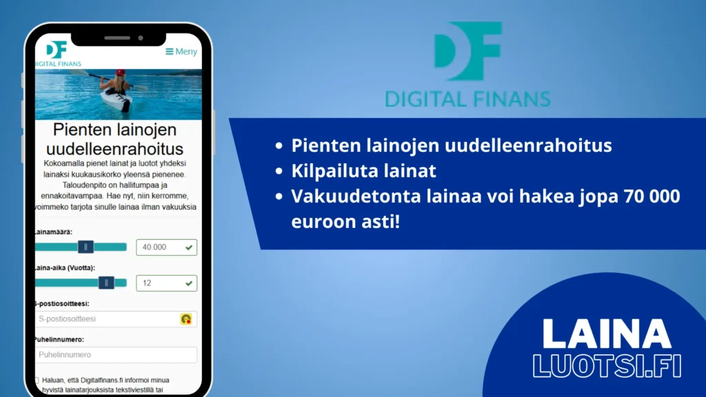 Käyttäjän näkökulmasta Digital Finans on mielestäni oikein hyvä vaihtoehto. Lainatarjouksen saat ihan yhtä suurella todennäköisyydellä kuin isommiltakin lainanvälittäjiltä. Ainut mielestäni selkeä miinus on vanhanaikainen sivusto, joka kaipaa kyllä uudistamista.