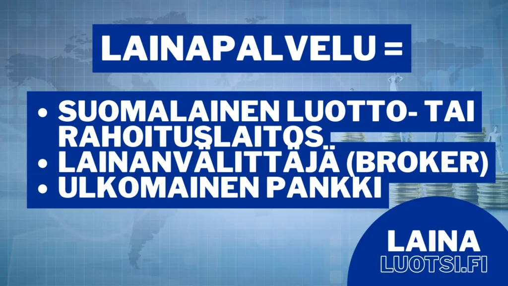 Lainapalvelut ovat suomalaisia rahoitus- ja luottolaitoksia tai ulkomaisia pankkeja. Kun me puhumme lainapalveluista, emme siis tarkoita S-Pankkia ja muita perinteisiä pankkeja.