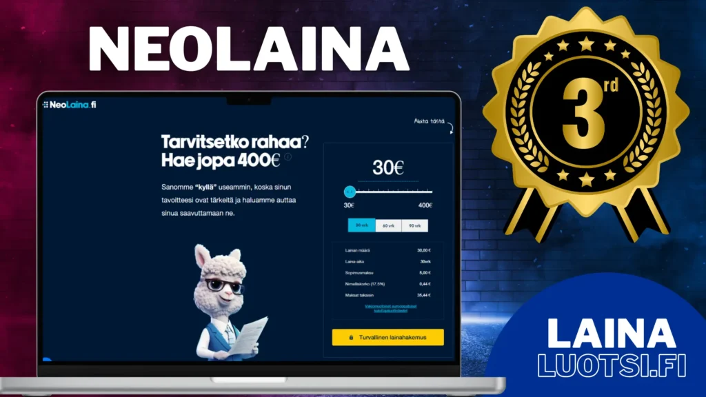 Tuolla lausahduksella Neolaina toivottaa sinut tervetulleiksi hakemaan lainaa. Neolaina on aidosti suomalainen lainapalvelu, jonka myöntämä pikavippi voi olla 30 eurosta aina 400 euroon asti – maksuaika on 30, 60 tai 90 päivää.