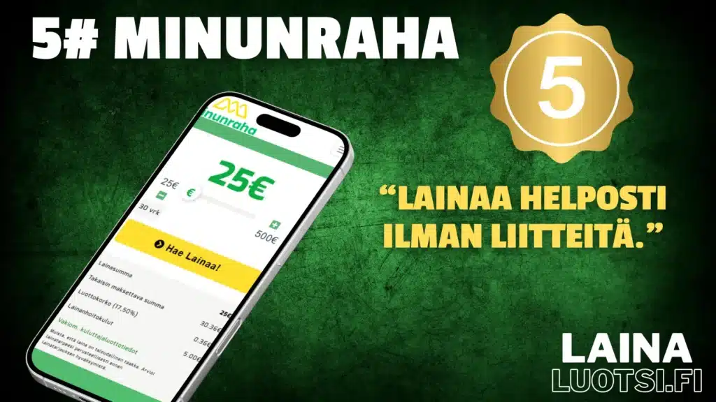 Viides todistetusti sujuva vaihtoehto on MinunRaha. Pientä 25–250 euron pikalainaa voivat hakea kaikki täysi-ikäiset, joilla on puhtaat luottotiedot sekä hyvä maksukyky. “Hyvä maksukyky” tarkoittaa, että uuden lainan saa maksettua takaisin.