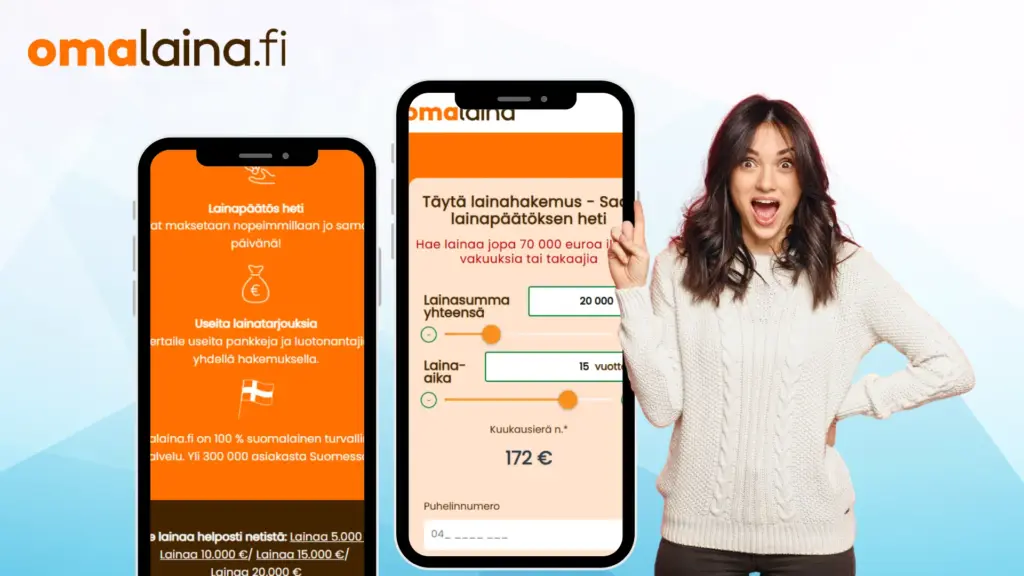 Omalaina on suomalainen lainanvälittäjä, joka kilpailuttaa ja listaa parhaat kulutusluotot yli 20 pankin otannalla. Hae lainaa 500 eurosta aina 70 000 euroon asti – kulutusluotto on mahdollista hakea myös pienillä kuukausituloilla.